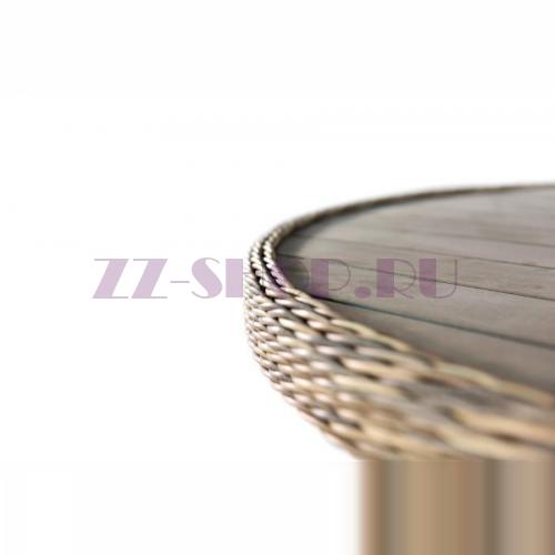 Круглая форма стола переплетена искусственным ротангом, известным своей долговечностью.