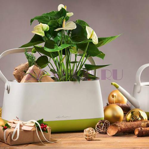 Благодаря фитильной системе автополива, пересадка из технического горшка, в котором было приобретено растение, не требуется.