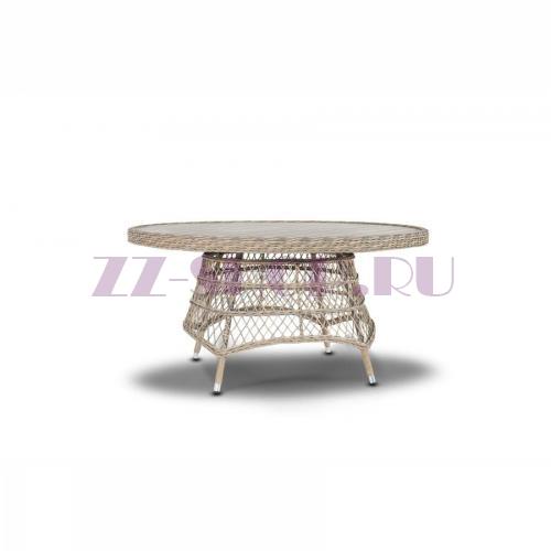 Круглая форма стола переплетена искусственным ротангом, известным своей долговечностью.