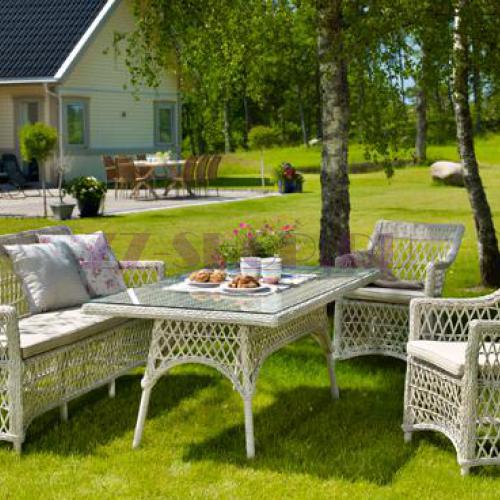Кресло 5691-5-20 с подлокотниками из коллекции Beatrice выполнено из искусственного ротанга белого цвета, в комплекте с креслами идет подушки бежевого цвета.