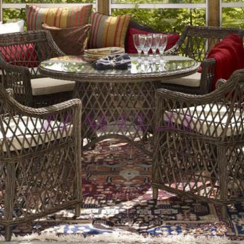Кресло 5691-60-20 с подлокотниками из коллекции Beatrice выполнено из искусственного ротанга коричневого цвета, в комплекте с креслами идет подушки бежевого цвета.