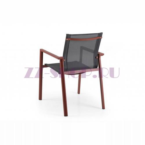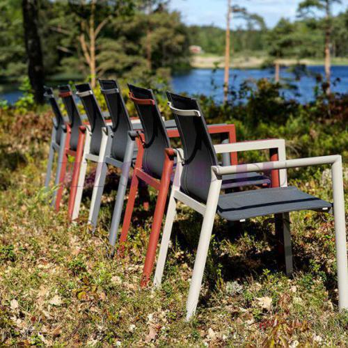 Delia - практичное штабелируемое кресло, выполненное из матового лакированного алюминия красного цвета с черным текстиленом.- brafab