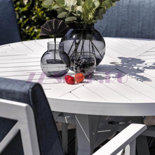 Большой круглый обеденный стол из коллекции Sottenville.Sottenville - это белая алюминиевая группа с классическим дизайном и красивой формой в виде креста сзади.